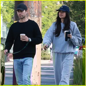 She was holding a to-go cup, while Chace held the leash for their dog.